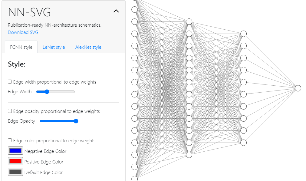 Illustrations of Neural Network architectures are often time-consuming to produce, and machine learning researchers all too often find themselves constructing these diagrams from scratch by hand. NN-SVG is a tool for creating Neural Network (NN) architecture drawings parametrically rather than manually. It also provides the ability to export those drawings to Scalable Vector Graphics (SVG) files, suitable for inclusion in academic papers or web pages. The tool provides the ability to generate figures of three kinds: classic Fully-Connected Neural Network (FCNN) figures, Convolutional Neural Network (CNN) figures of the sort introduced in the LeNet paper, and Deep Neural Network figures following the style introduced in the AlexNet paper. The former two are accomplished using the D3 javascript library and the latter with the javascript library Three.js. NN-SVG provides the ability to style the figure to the user's liking via many size, color, and layout parameters.