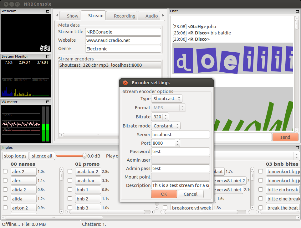Nautic Radio Broadcast Console is a darkice (shoutcast / icecast source client available at http://darkice.org/ ) frontend, that allows you to play jingles (audio samples), capture a webcam images to send to an FTP, chat with listeners (through an external webchat site) and monitor your audio and system (cpu, network)