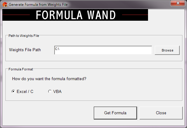 The NeuroSolutions: Formula Generator utility converts the weights file of a default MLP breadboard (1-hidden layer with a TanhAxon in the hidden layer and either a TanhAxon or BiasAxon in the output layer) into a usable formula that can be copied and pasted into your own programs to compute the output of the trained neural network.