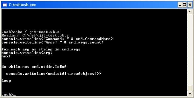 NSH (.NET Shell) is an open source, object-oriented command-line shell built on the Microsoft.NET Framework and Visual Basic.NET and inspired by BASH. It consists of a full-featured scripting engine based on VB.NET and growing script library.