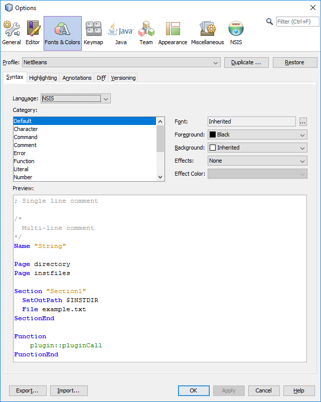 Provides support for NSIS (Nullsoft Scriptable Install System) in NetBeans IDE. Features include file type recognition for *.nsi script files and *.nsh header files, file type recognition for *.nsddef and *.nsdinc NSIS Dialog Designer files and syntax highlighting.