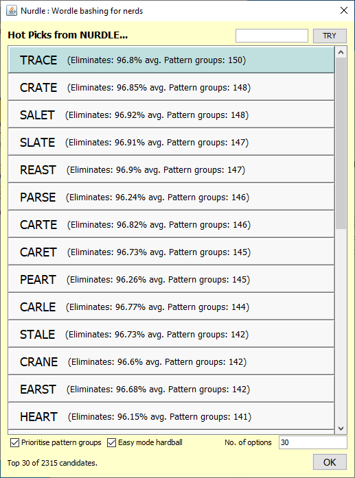 Nurdle helps you make strong guesses when playing Wordle, by analysing the performance of words from Nurdle's dictionary against all remaining secret word candidates. It will let you step back and replay your moves, so you can try out different guesses and strategies. Nurdle can play Wordle in both easy mode and hard mode.