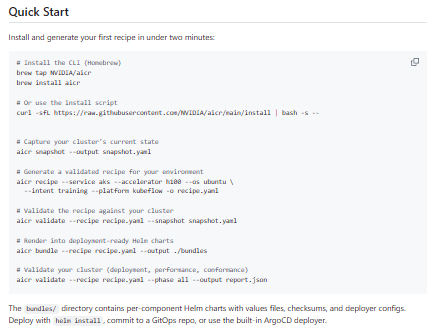NVIDIA AI Cluster Runtime (AICR) is an emerging project within NVIDIA’s AI infrastructure ecosystem focused on enabling advanced AI compute and runtime workflows, though publicly available documentation remains limited. Based on its positioning within NVIDIA’s repositories, it is designed to support scalable AI runtime environments, potentially addressing challenges related to orchestration, resource management, or reproducible AI execution. The project likely aligns with NVIDIA’s broader strategy of building modular infrastructure layers that integrate with GPU-accelerated workloads and cloud-native systems. It appears to emphasize automation, consistency, and performance optimization across AI pipelines, potentially targeting enterprise and research use cases. Given NVIDIA’s ecosystem, it may also integrate with containerized environments, Kubernetes, or other orchestration frameworks.