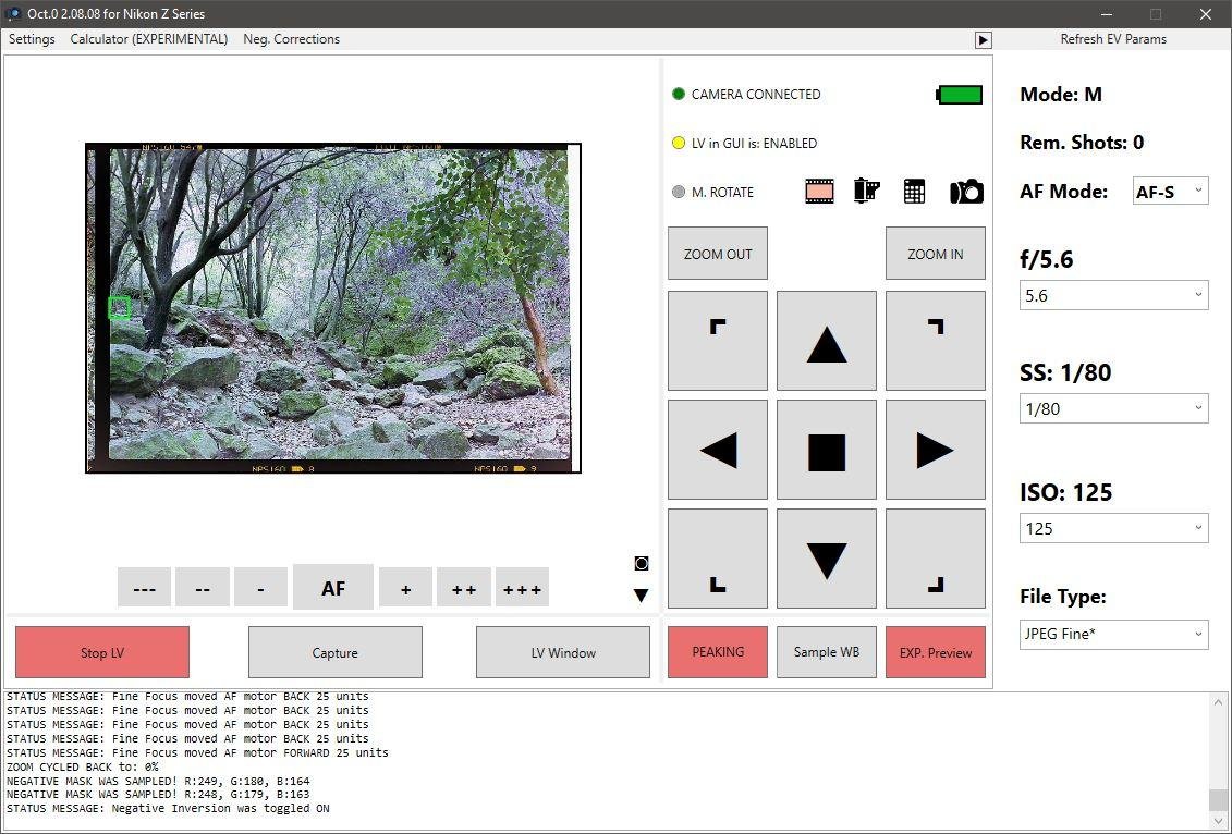 Based on Nikon SDK C# wrapper and EMGU repositories - Oct.0 is a standalone Windows 64bit lightweight app, developed to remotely control select Nikon Z Mirrorless camera bodies by means of wired or wireless controllers attached to a x64 PC. Oct.0 allows for replicating most of the camera body controls (buttons) functions via GUI buttons or keyboard shortcuts, as well as allowing tethering functions such as saving the files to destination folder on a PC, and invoking a remote LiveView session.