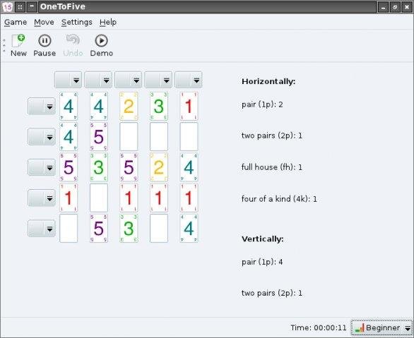 OneToFive is a mathematical game written in Ruby with a Qt4 GUI. The goal is to fill in a grid with numbers from 1 to 5 using vertical and horizontal combinations (pair, two pairs, three of a kind, straight, full house, ...) that are given.