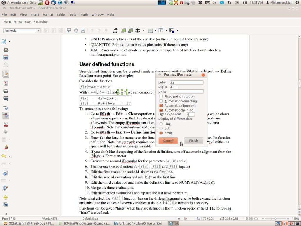 I downloaded iMath to handle some convoluted financial calculations in a report to a vendor using LibreOffice Writer. I like it, finding it easy to use. While the calculations worked great, I did run into a number of minor issues: 1. No formatting capability for currency, especially the dollar sign and the traditional commas to separate currency amounts. For example: <dollar sign>1,234,567.89 2. I could not use the value of an iMath calculation in a sum function in a table 3.I wich your wiki included a list of included functions, with parameters. Whether these issues are fixed, or not, I plan to continue to use iMath. I really like it!!
