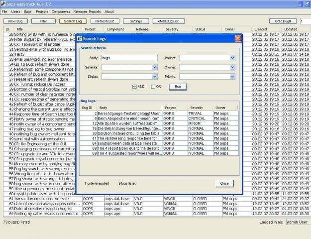 Oops-easytrack is a Bug Tracking System, implemented as a wlan-, web- and RMI-based version. Bugs are created, modified, logged or searched. Users, projects,components and releases can be administrated. Reports of 4 types may be generated.