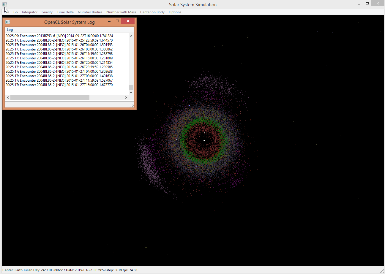 Uses OpenCL to accelerate the integration of a large number of solar system bodies.