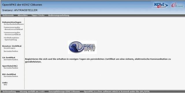 Realisierung einer VerwaltungsPKI(V-PKI) mit OpenSource(openCA,openSSL,openLDAP) unter der ROOT CA des BSI. Bereitstellen der notwendigen Benutzeroberflaeche und Dokumente: CP,CPS, Dienstanweisung,Mustervertrag,Benutzeranweisungen,DB-Beschreibung