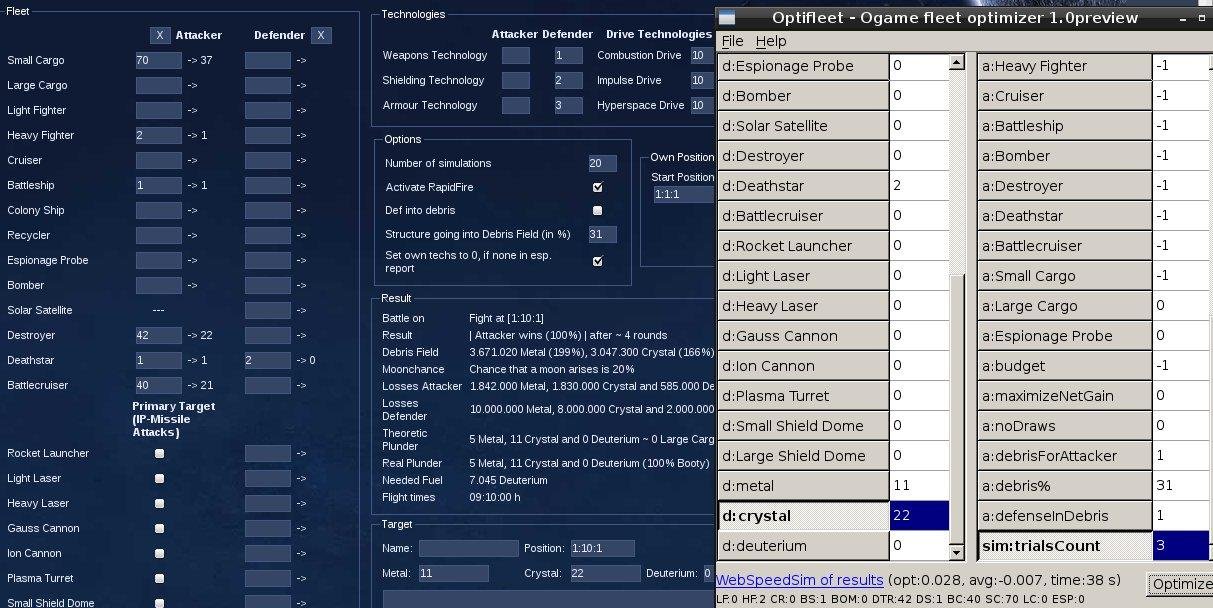 A tool for Ogame browser game, performing advising the best selection of fleet to optimize {cost_of_production+looses+fuel used} under selected conditions, through smartly performing many simulations (multidimensional optimization).