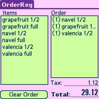 OrderReg is a simple cash register and order tallying program for PalmOS handhelds. It is useful for sales situations where a small number of fixed-price items may be purchased (i.e. food sales, craft sales, fundraisers, etc).