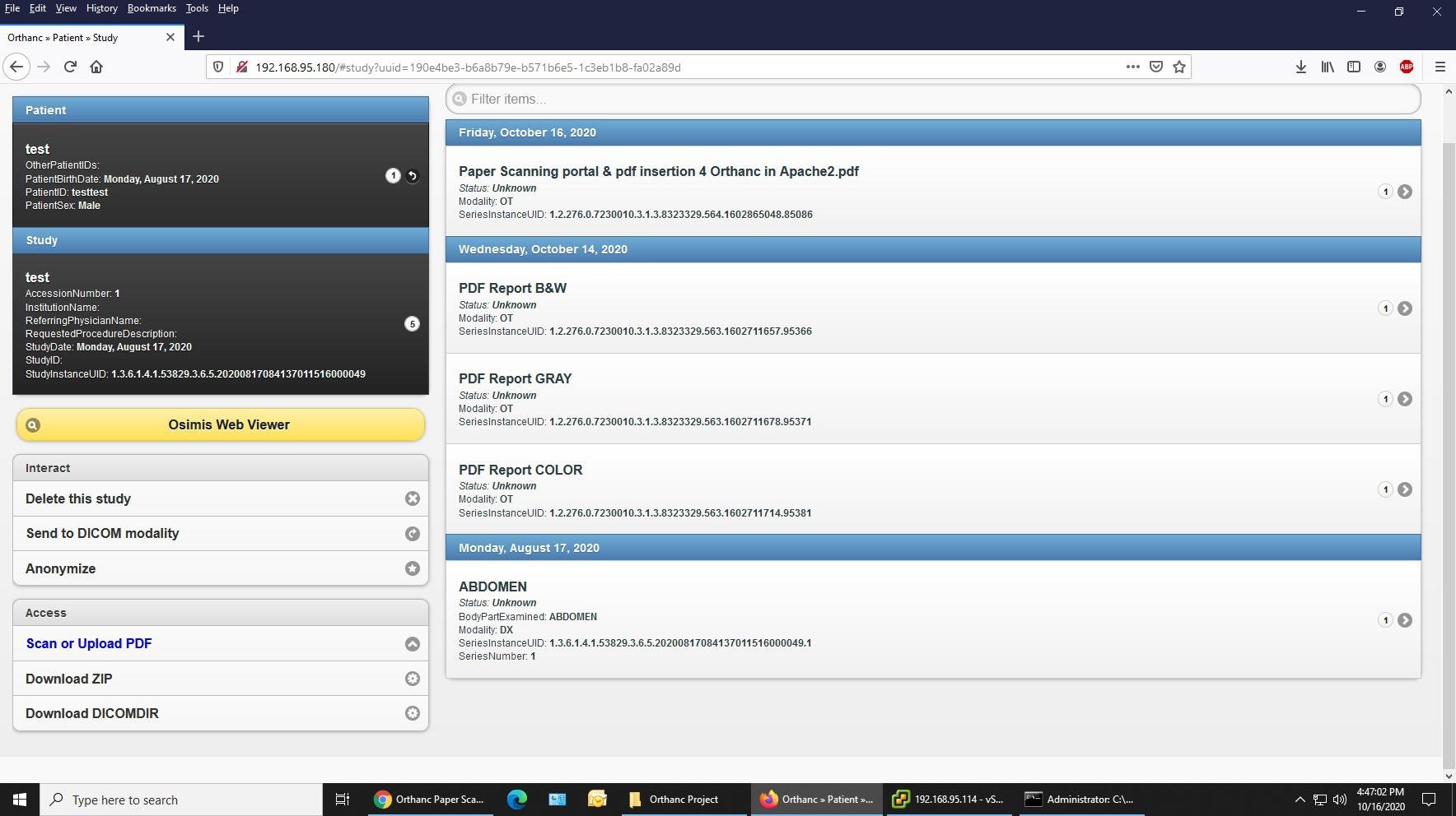 The following project is a paper scanning portal that gives the Orthanc Pacs server the ability to interface with twain/wia scanners and insert the resulting pdf into the Orthanc database using a web interface integrated into the Orthanc web console.
