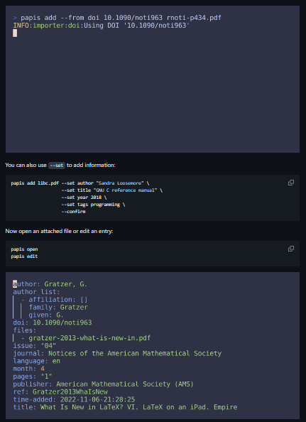 Papis is a powerful and highly extensible CLI document and bibliography manager. With Papis, you can search your library for books and papers, add documents and notes, import and export to and from other formats, and much much more. Papis uses a human-readable and easily hackable .yaml file to store each entry's bibliographical data. It strives to be easy to use while providing a wide range of features. And for those who still want more, Papis makes it easy to write scripts that extend its features even further.