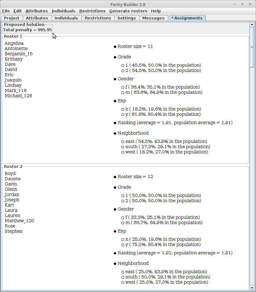 Parity Builder constructs rosters from individuals with the goal of making the rosters as comparable as is possible. Sample applications include building teams in recreational sports leagues and assigning students to project teams or study groups.