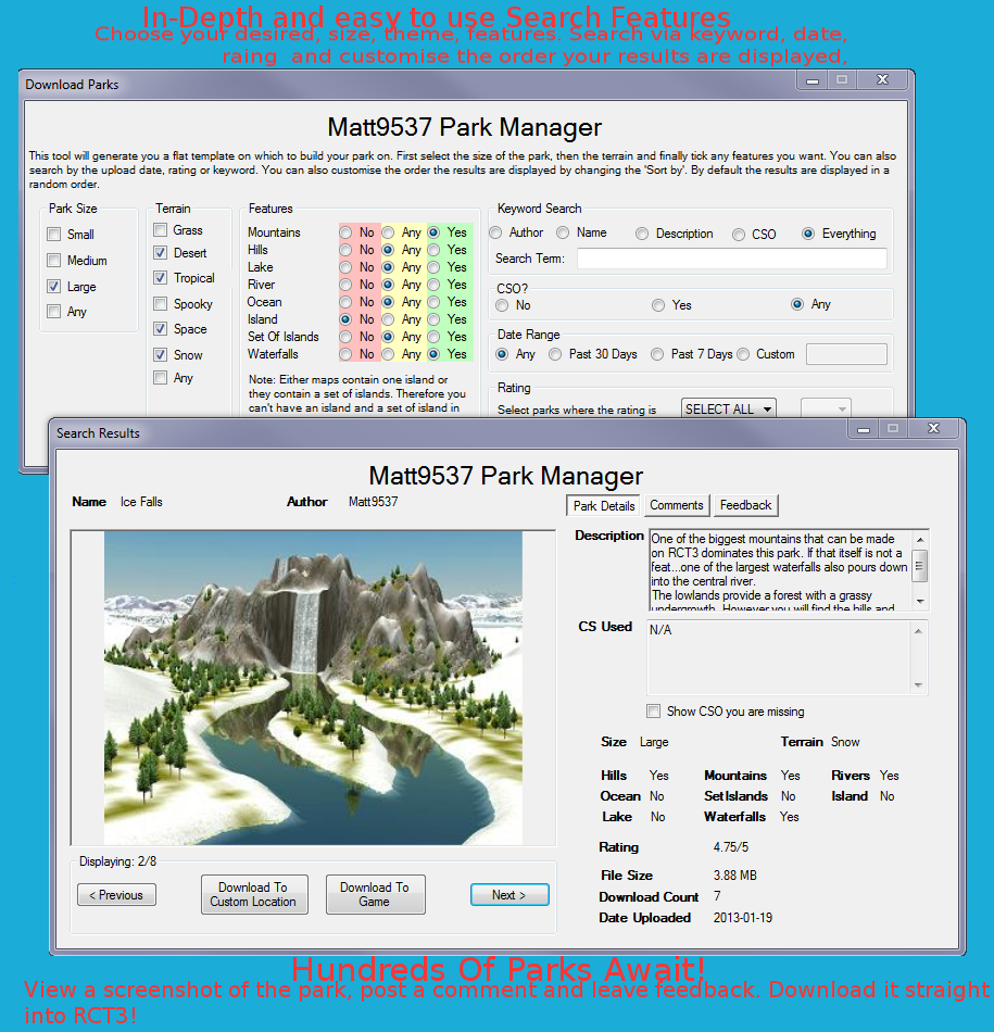 - Download pre made parks to a custom directory or straight into your game