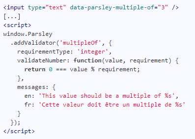 Parsley, the ultimate JavaScript form validation library. Validating forms frontend have never been so powerful and easy. Like no other form validation library, simply write in English your requirements inside your form HTML tags, Parsley will do the rest! No need to write even a single JavaScript line for simple form validation. Parsley is now smarter, it automatically detects your forms' modifications and adapts its validation accordingly. Simply add, remove or edit fields, Parsley validation will follow! Parsley is shipped with more than a dozen useful validators. If not enough, use the awesome Parsley extra Ajax validator or tons of other extended validators provided by the community. Parsley strongly focuses on #UI and #UX. Override almost every Parsley default behavior to fit your exact needs. Still ships almost bug free. Parsley is strongly tested, and aims to work on every browser (including IE8).