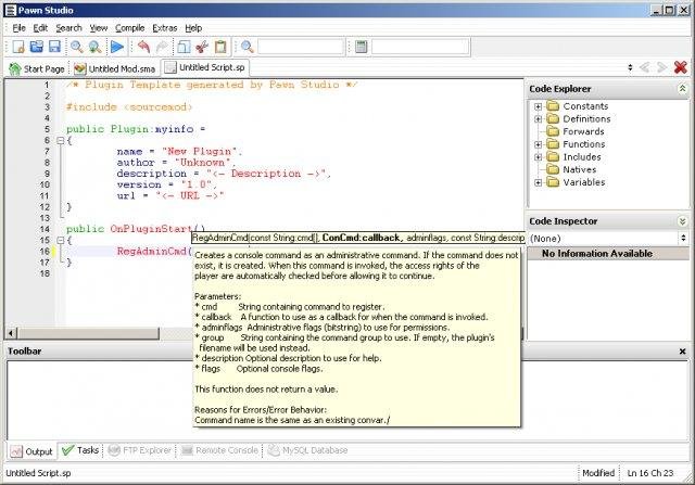 Pawn Studio is an enhanced IDE for Pawn which supports several features like syntax highlighting, code parsing, auto-indentation, auto-completition, call tips and Doxygen parsing. It also supports RCON for HL1, HL2 and GTA SA:MP and has an FTP explorer.
