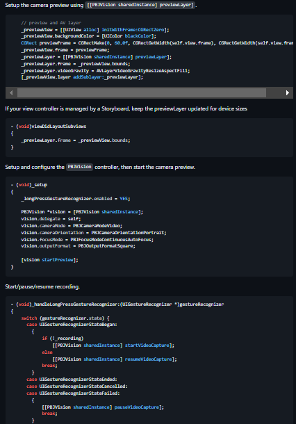 PBJVision is a camera library for iOS that enables easy integration of special capture features and camera interface customizations in your iOS app. Next Level is the Swift counterpart. Capture is also possible without having to use the touch-to-record gesture interaction as the sample project provides. This library was originally created at DIY as a fun means for kids to author videos and share their skills. The touch-to-record interaction was pioneered by Vine and Instagram.