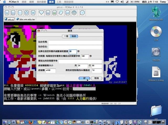 PCMan is an easy-to-use telnet client mainly targets BBS users formerly running under MS Windows. PCMan X is a newly developed, open-source and cross-platform version written with wxWidgets, supporting X Window, MS Windows, and Mac OS X.