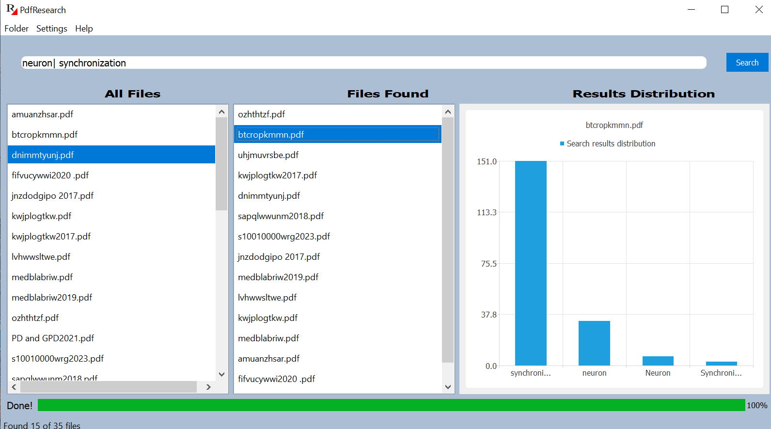 Extracts and searches text from pdf, docx, and text files in a folder. This software can search for multiple keyword combinations. When done, it ranks the search results according to the highest count and distribution of keywords.