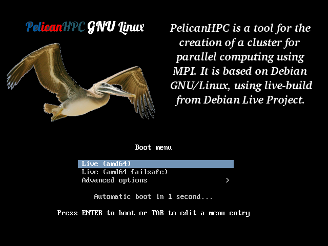 PelicanHPC is an iso-hybrid (CD or USB) image that let's you set up a high performance computing cluster in a few minutes. A Pelican cluster allows you to do parallel computing using MPI. You can run Pelican on a single multiple core machine to use all cores to solve a problem, or you can network multiple computers together to make a cluster. The frontend node (either a real computer or a virtual machine) boots from the image. The compute nodes boot by PXE, using the frontend node as the server. All of the nodes of the cluster get their filesystems from the same image, so it is guaranteed that all nodes run the the same software. Packages can be added to all nodes using apt-get, thanks to aufs. The bootable image is created by running a single script, which takes advantage of the Debian Live infrastructure.