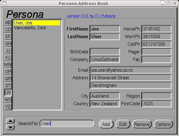 Persona is a personal address book application. It is dated now, but still works and is interesting for its support of both gui and text modes.
