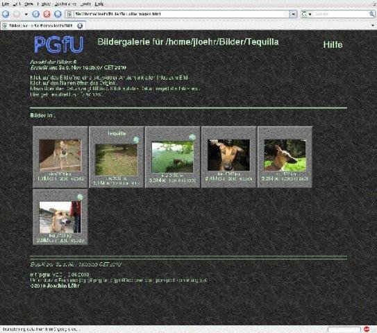 PGfU (Picture Galerie for UNIX) PGfU erzeugt in einem Verzeichnis eine HTML-Galerie aller vorhandenen Bilder und Videos mit Links zu weiteren Galerien in diesem Pfad. Diese Galerien enthalten ExifDaten, GPS Angaben (auch für Google-Maps) und eine Sl