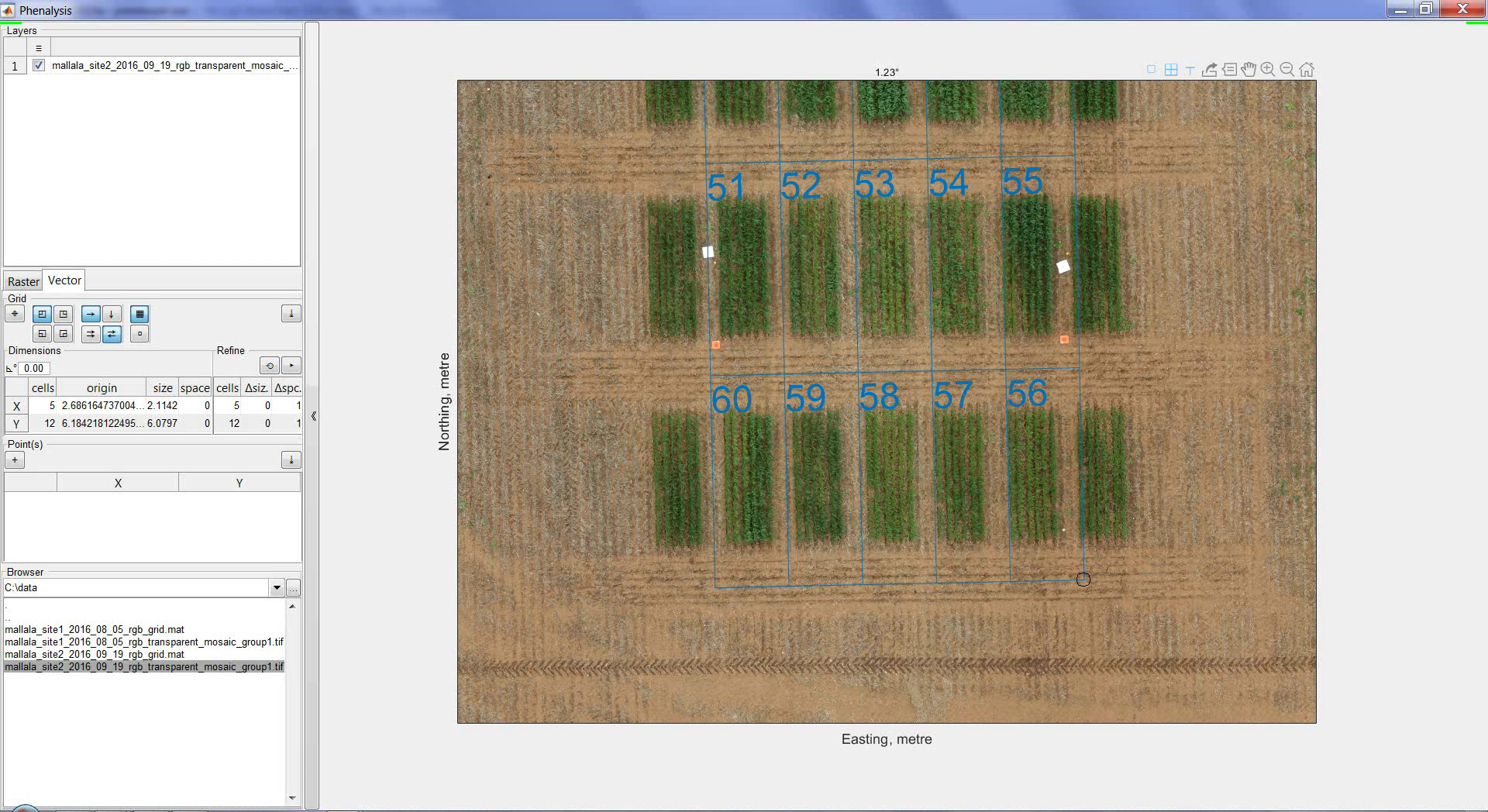 - Import, display, crop and register georeferenced raster (RGB/multispectral/thermal) images of agronomic trials.