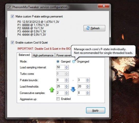A utility to completely customize the Cool and Quiet feature of AMD K10 (Phenom etc.) processors. It may be used to overclock and/or undervolt the CPU, providing a high degree of tweaking flexibility.