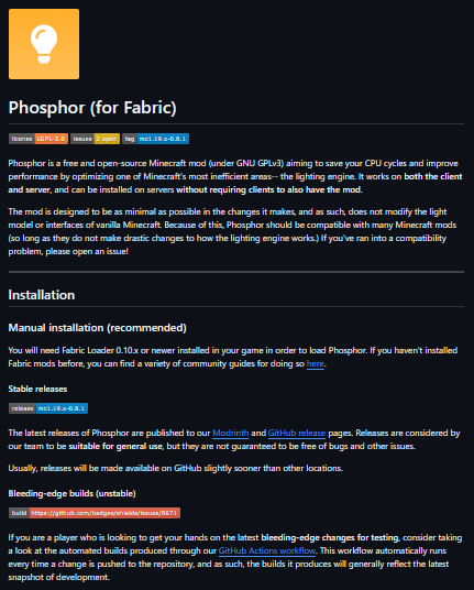 Phosphor is a free and open-source Minecraft mod (under GNU GPLv3) aiming to save your CPU cycles and improve performance by optimizing one of Minecraft's most inefficient areas-- the lighting engine. It works on both the client and server and can be installed on servers without requiring clients to also have the mod. The mod is designed to be as minimal as possible in the changes it makes, and as such, does not modify the light model or interfaces of vanilla Minecraft. Because of this, Phosphor should be compatible with many Minecraft mods (so long as they do not make drastic changes to how the lighting engine works.) If you've ran into a compatibility problem, please open an issue.