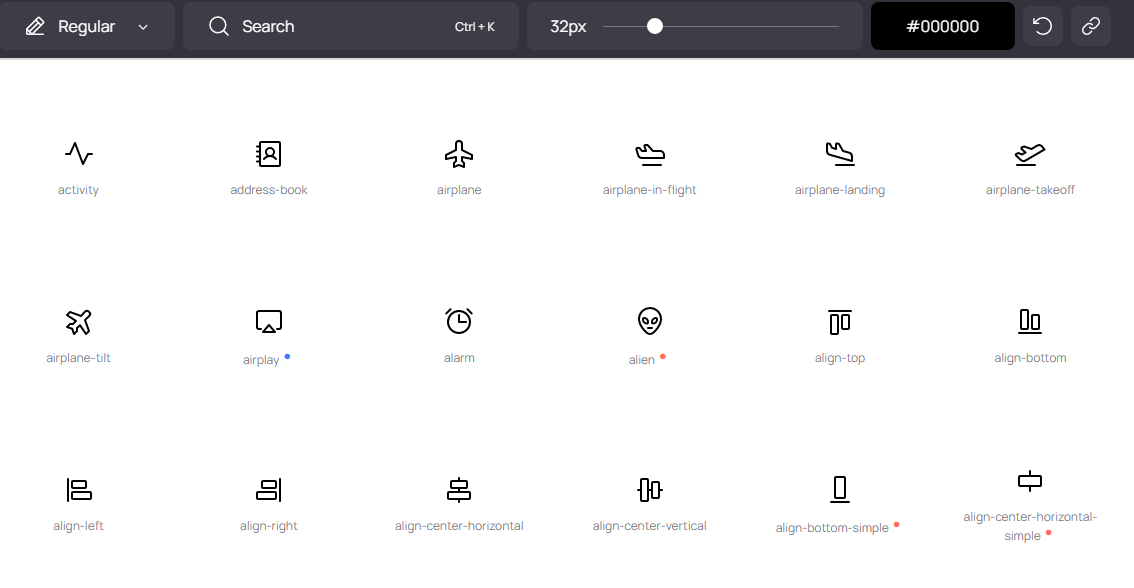 Phosphor is a flexible icon family for interfaces, diagrams, presentations, whatever, really. 1047 icons and counting. 6 weights: Thin, Light, Regular, Bold, Fill, and Duotone. Designed at 16 x 16px to read well small and scale up big. Raw stroke information retained to fine-tune the style. We use a similar approach as many other icon sets out there, providing icons as a webfont that uses Unicode's Private Use Area character codes to map normally non-rendering characters to icons. But you don't need to know that. Phosphor's intuitive but powerful API can style the color, size, and weight of an icon with a few keystrokes, provide default styles to all icons via the Context API, or directly manipulate the SVG at runtime through render props to do some amazing things! Supports tree-shaking, so your bundle only includes code for the icons you use.