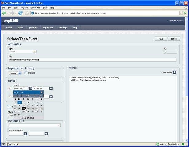 phpBMS is a PHP, MySQL based billing, scheduling, and client management system. Visit out project web site for more information.