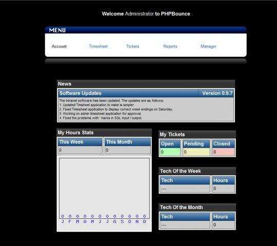 This web application is used to manage day to day service related businesses. PHPBounce comes with a multi tiered user system with Admin / Manager / Users, timesheet management, ticketing system, client database, invoice system, credit card processor (google checkout / google wallet). Client portal for your clients to keep track of invoices, tickets, and make payments.