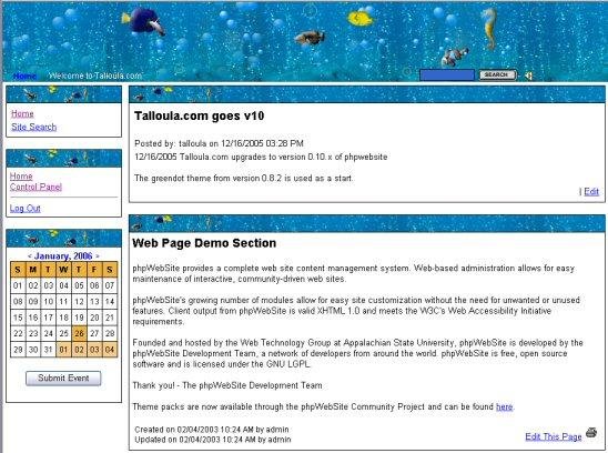 This site hosts themes and mods for phpwebsite & misc. stuff featured on http://www.talloula.com. Themes include greendot, Aqua, WinXP2, and mods such phpmovielib (a dvd database), pwsthemes (demo any Theme), and phpwsMaps (driving directions) and more