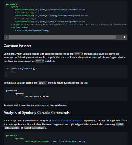 Symfony extension for PHPStan. Sometimes, when you are dealing with optional dependencies, the ::has() methods can cause problems. For example, the following construct would complain that the condition is always either on or off, depending on whether you have the dependency for service installed. You can opt in for more advanced analysis of Symfony Console Commands by providing the console application from your own application. This will allow the correct argument and option types to be inferred when accessing $input-getArgument() or $input->getOption().