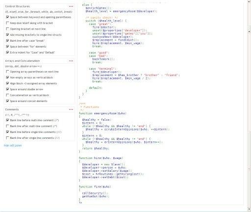 Format, clean-up, beautify and standardize your php code with a comprehensive set of 34 options. A single 50Kb file that will highly improve the quality of your code. 3 operation modes: web interface, command line and PSPad integration.