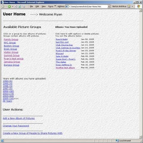 Picturesque is a photo and movie sharing community web site that you run on your own server. It allows web site users to upload albums of pictures and movies and share them with any of the groups he is a member of. Java/JSP/PostgreSQL/Struts/ibatis