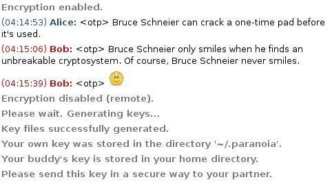 Pidgin-paranoia is a plug-in for Pidgin (formerly known as Gaim) that provides information-theoretically secure encrypted conversations using one-time-pads.