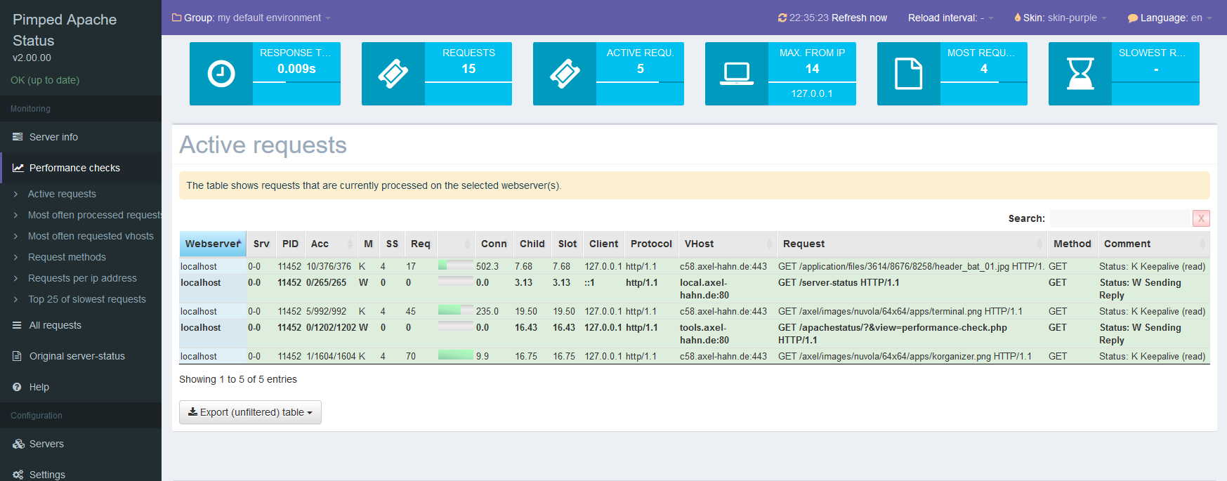 The pimped Apache status makes the Apache server status readable, sortable and searchable.