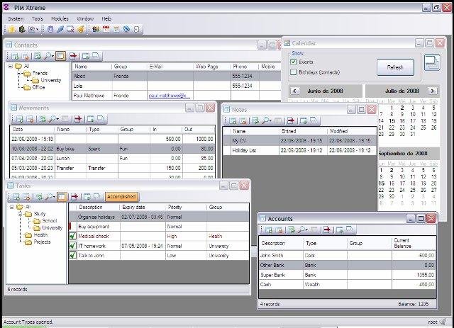 PIM Xtreme is an organizer (or Personal Information Manager) Software with: financial module (accounts, reports, etc.), contacts, schedule, tasks, alerts, encrypted notes and MORE! It's highly VERSATILE and it exports to several formats (xml, iCal, etc.