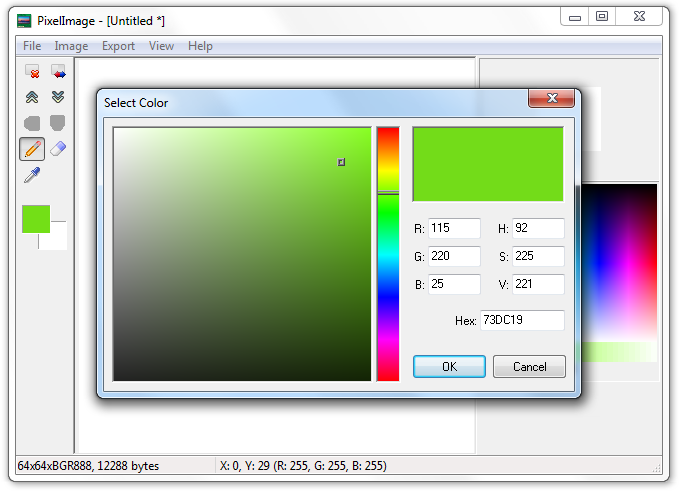 Program provide very limited set of paint functions, so if you want to make some graphics from scratch, maybe it will be better to use another image editor and copy-paste or import drawings to PixelImage.