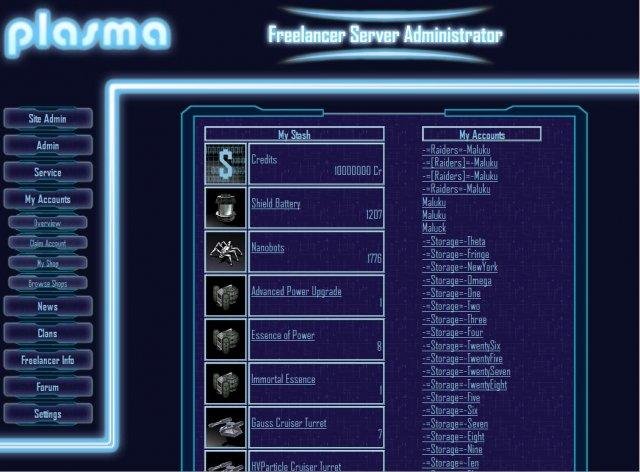 Plasma is a server operator for the Microsoft game "Freelancer" written purely in Perl. It provides easy server and player management, a community portal and the possiblity for players to save and exchange items online.