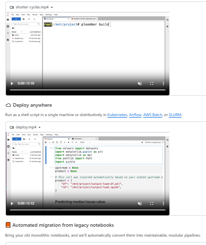Ploomber is an open-source framework designed to simplify the development and deployment of data science and machine learning pipelines. It allows developers to transform exploratory data analysis workflows into production-ready pipelines without rewriting large portions of code. The system integrates with common development environments such as Jupyter Notebook, VS Code, and PyCharm, enabling data scientists to continue working with familiar tools while building scalable workflows. Ploomber automatically manages task dependencies and execution order, allowing complex pipelines with multiple stages to run reliably. The framework can deploy pipelines across different computing environments including Kubernetes, Airflow, AWS Batch, and high-performance computing clusters. It also helps teams maintain reproducibility by tracking changes in code and rerunning only outdated pipeline tasks.