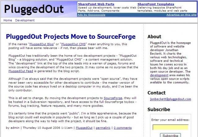 The PluggedOut Project family: Blog--run on your own web server, providing an online multi-user journal. Supports themes, RSS, multiple authors. CMS--flexible and powerful content management system for PHP/MySQL based systems. Multi-user management.