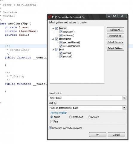 this plugin is toolbox for php développers, it create in Php Developpement tools a few shortcut menu, particular with regard of the generation of getters and setters and few templates class creation. Last version is an update package.