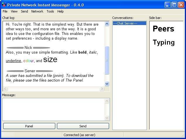 Private Network Instant Messenger (PNIM) is an open source cross platform instant messaging program. It allows instant messaging without the need for a third party centralised server, such as MSN's. PNIM works across a LAN, or over The Internet.