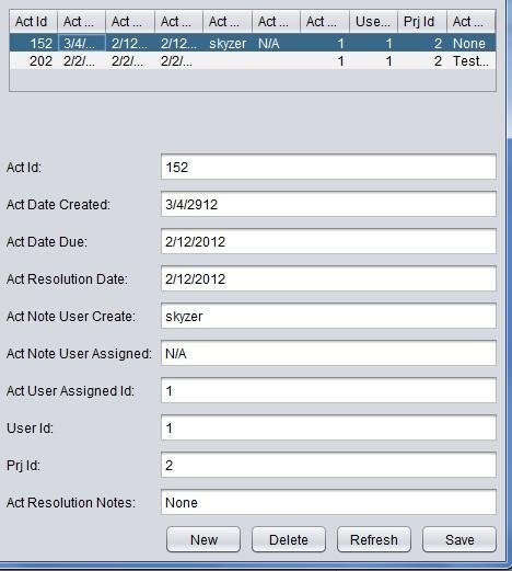 Report views such as project completion will be a function of total project activities completed. For smaller groups there is an embedded SQLite database that comes with the program. However, the program can be easily modified to work with MySQL or Oracle 11g. Please feel free to request these SQL scripts as they have been created and tested. The front end will be a basic java desktop application which can be easily distribute from the network. It can be distributed via a signed JNLP.