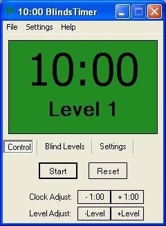 A Poker Blinds Level Timer application. This application can be used at home poker games to keep players informed of the current blind level (small blind and big blind amounts) for a Texas Holdem tournament. It also displays the running time remaining.