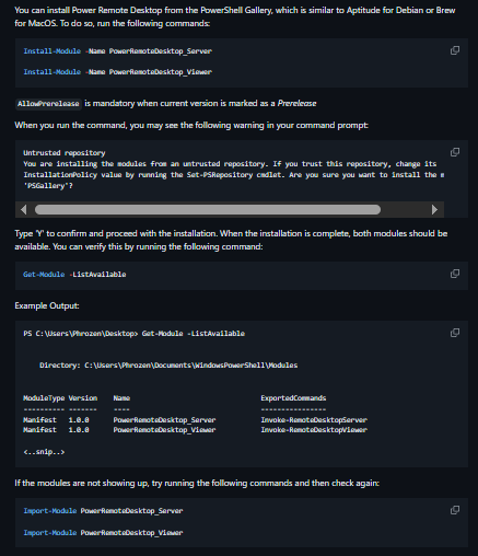 PowerRemoteDesktop is a remote desktop solution written completely in PowerShell. It implements both server and viewer (client) components using a custom protocol written in PowerShell, allowing remote control of desktops (mouse, keyboard), clipboard synchronization, cursor icon replication etc. It uses encrypted communication (TLS), supports both password-challenge and certificate-based authentication, and strives to offer an end-to-end remote desktop experience using only PowerShell. It’s intended for Windows systems and tested on recent versions.