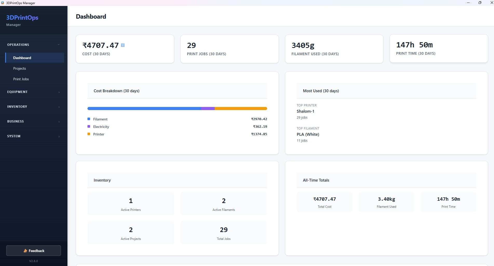 3DPrintOps Manager runs entirely offline and stores all data locally on the user’s machine. No cloud services, accounts, or internet connectivity are required. The software is distributed as a community edition, free for personal and internal business use, and is provided as a prebuilt Windows installer.